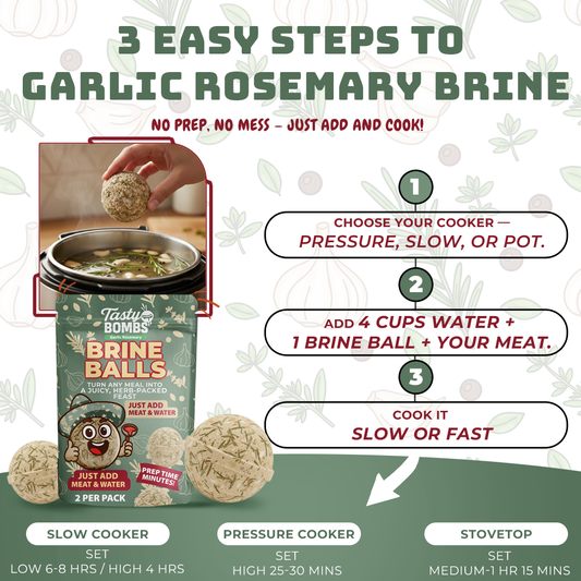 Using a TastyBomb® is simple. Choose your protein or base, add 1–2 TastyBombs® to your pot, slow cooker, or pressure cooker, and pour in water or broth. As it cooks, the flavor slowly releases and transforms your meal into a bold, restaurant-quality dish with minimal effort.